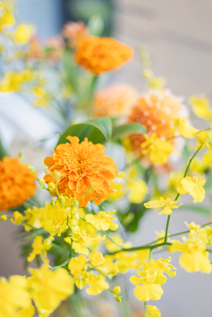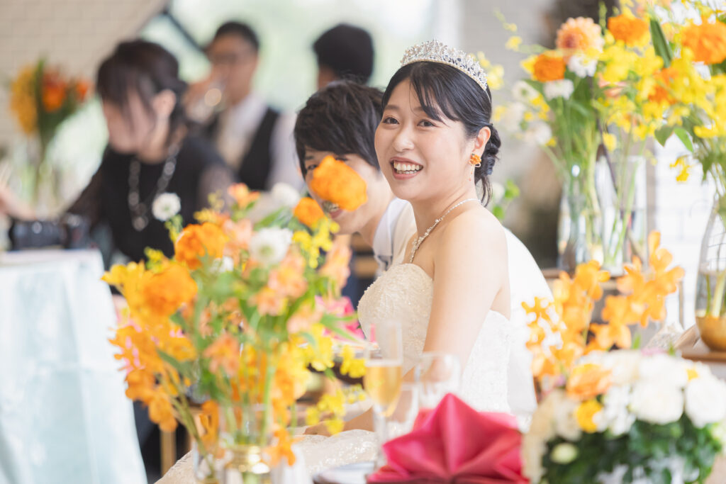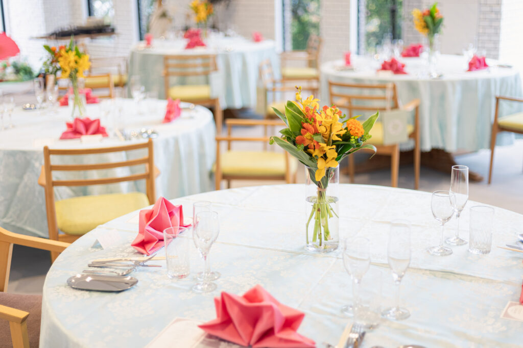 装花は明るいオレンジとイエロー、テーブルナプキンのピンクが差し色となっており華やかな印象です。
